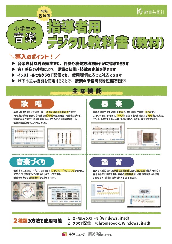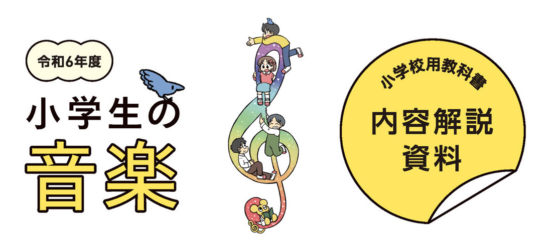 内容解説資料/検討の観点別に見た特色/二次元コード コンテンツ一覧/掲載曲一覧/編修趣意書/題材と系統一覧/年間学習指導計画作成資料/指導計画案(主な学習の流れと題材の評価規準例)/複式学級用 年間学習指導計画例/指導用CD・鑑賞用CD・音楽授業支援DVD収録内容/「音楽づくり」の6年間の学習の流れ