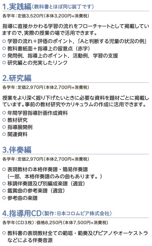 ①実践編 ②研究編 ③伴奏編 ④指導者用デジタル教科書(教材)
