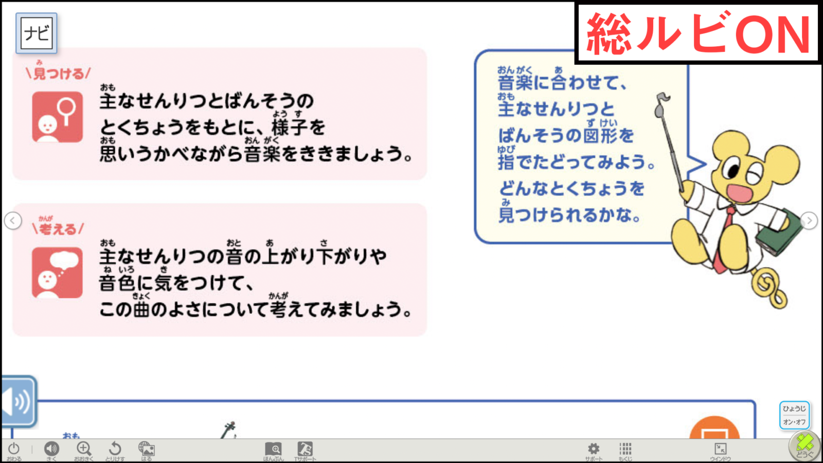 「指導者用デジタル教科書(教材)」は、指導者が大型提示装置に映し出して使用します。教科書の紙面が大きく表示され、「学習者用デジタル教科書」と同様に、紙面の拡大や書き込みができるほか、音源や映像などさまざまなコンテンツが収録されており、指導に役立てることができます。