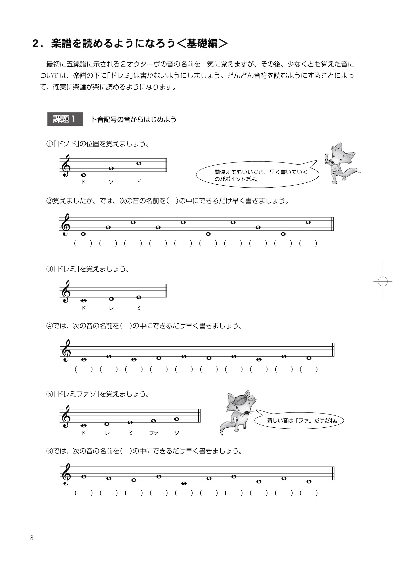 ○五線と鍵盤、リズムと拍子など音楽の基礎的な知識を丁寧に解説し、それぞれに学習したことを確認できるワーク部分を用意している。