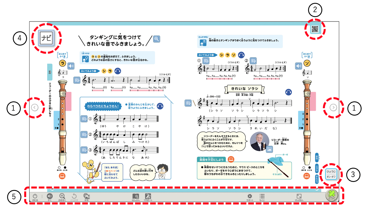・リコーダーの教材では、音源と楽譜、運指が連動します。
