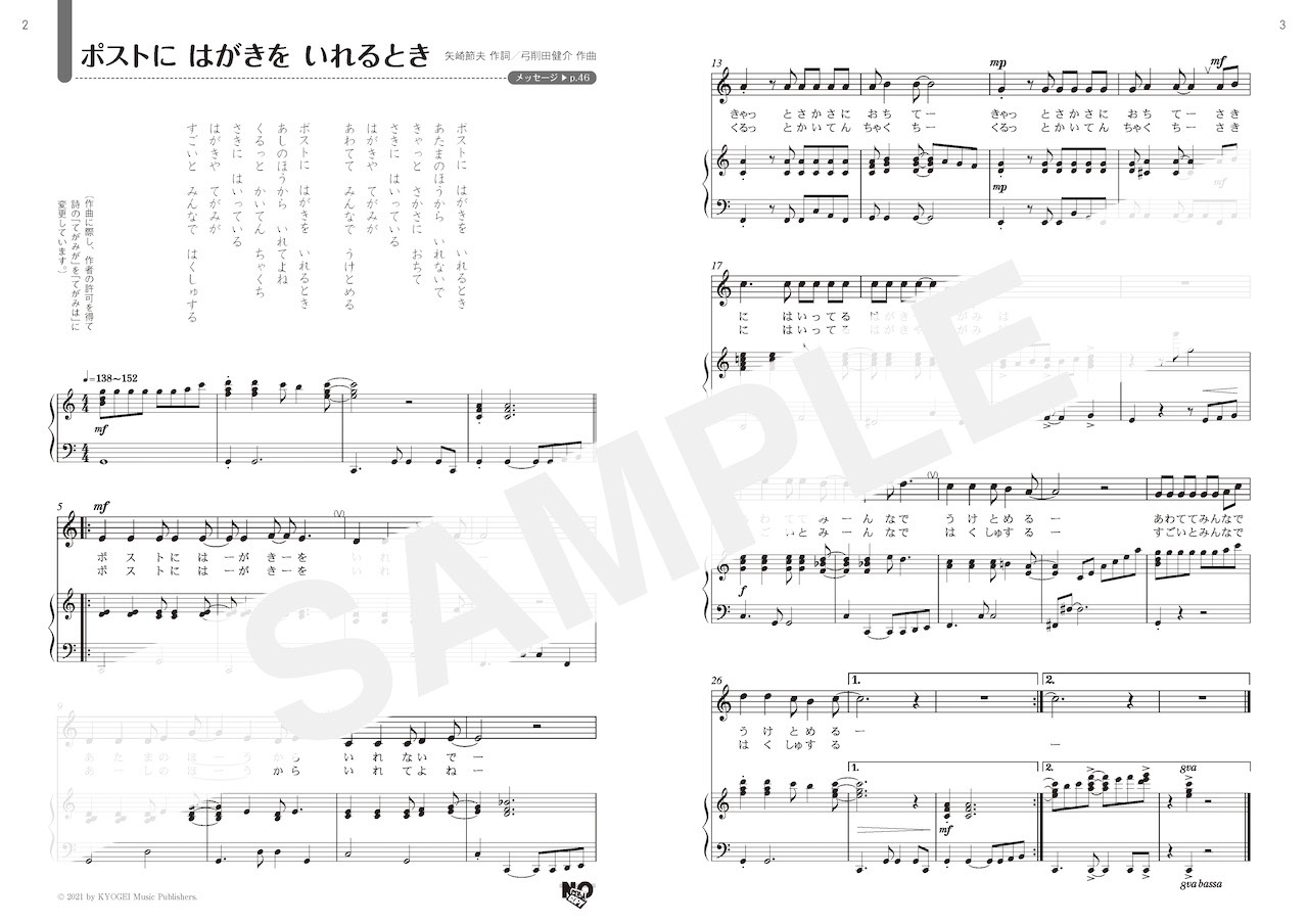 「はがき」を主人公にしたユーモアたっぷりの歌詞に,明るくノリのよい音楽が付いた可愛らしい作品。リズムに気を付けながら,「きゃっと さかさに おちて」「くるっと かいてん ちゃくち」のリフレイン部分も楽しんで歌って欲しいです。