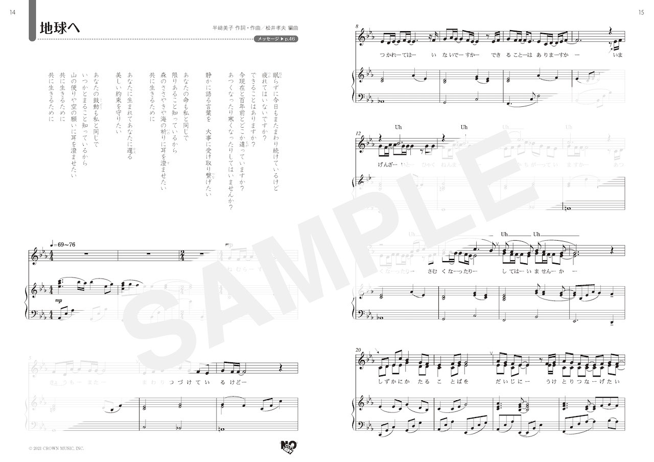 「私たち人間は,地球からのメッセージに素直な心で耳を傾け,地球への感謝の気持ちをいつも忘れずに生きていきたい」という作者のメッセージが込められた作品。作者の思いを受け止めて,優しさと強さのある音楽を皆さんの手でつくり上げて欲しいです!