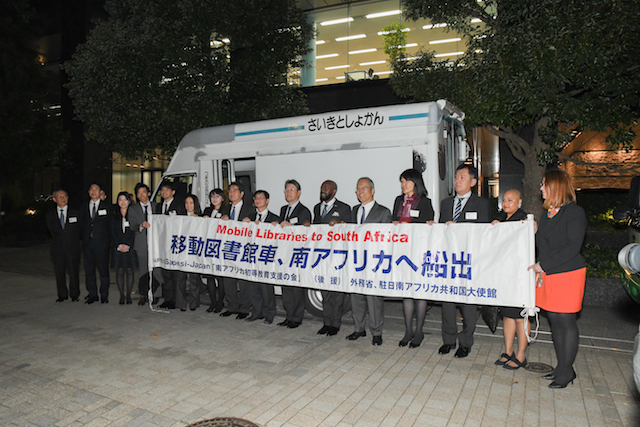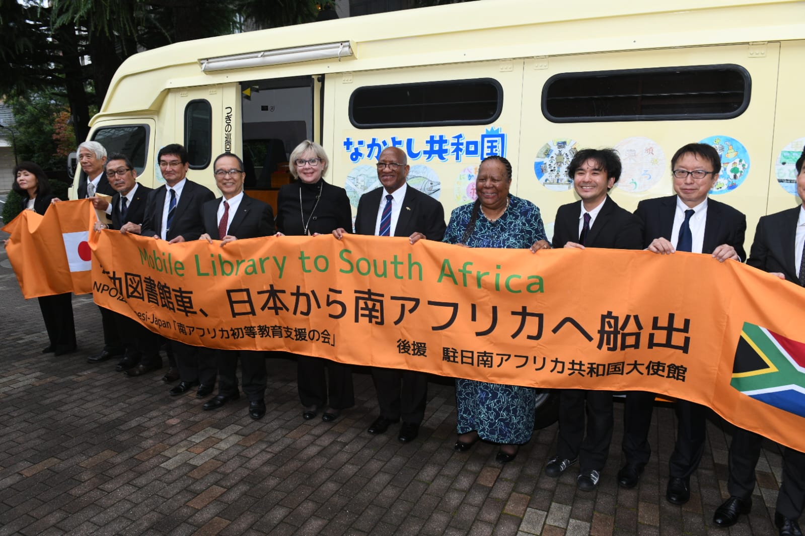 3台の移動図書館車が日本から出港することが決まり、南アフリカ共和国大使館にて、出港セレモニーが行われました。うち1台は“図書館で会いましょう”プロジェクトによるもので、兵庫県の神戸市立図書館より車両をご提供いただき、南アフリカ共和国ムプマランガ州教育庁に届けられることになりました。