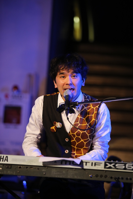 制作を手がけた弓削田健介先生は、作品集『図書館に会いましょう』の表紙デザインとおそろいのキリン柄の衣装で登場!