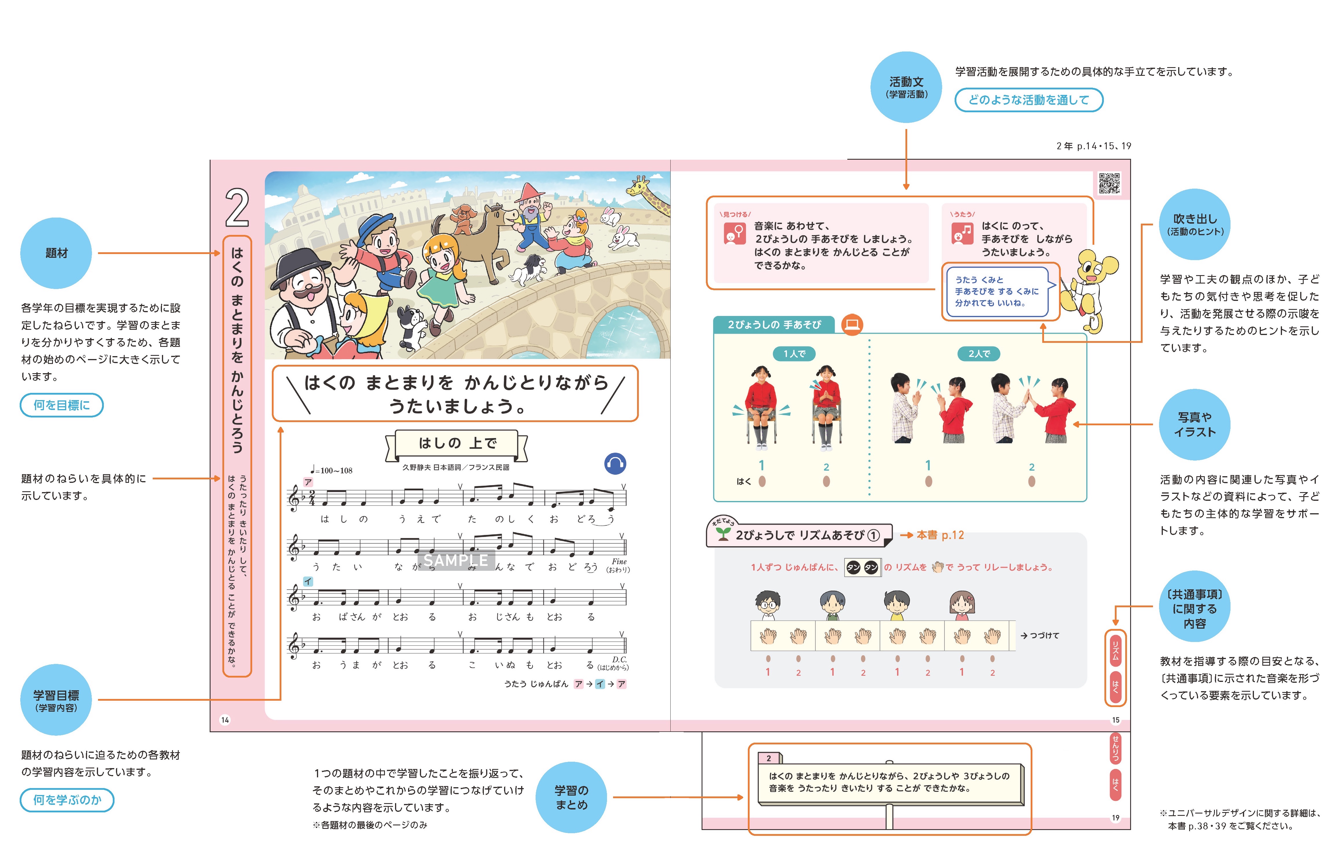 内容解説資料/検討の観点別に見た特色/二次元コード コンテンツ一覧/掲載曲一覧/編修趣意書/題材と系統一覧/年間学習指導計画作成資料/指導計画案(主な学習の流れと題材の評価規準例)/複式学級用 年間学習指導計画例/指導用CD・鑑賞用CD・音楽授業支援DVD収録内容/「音楽づくり」の6年間の学習の流れ
