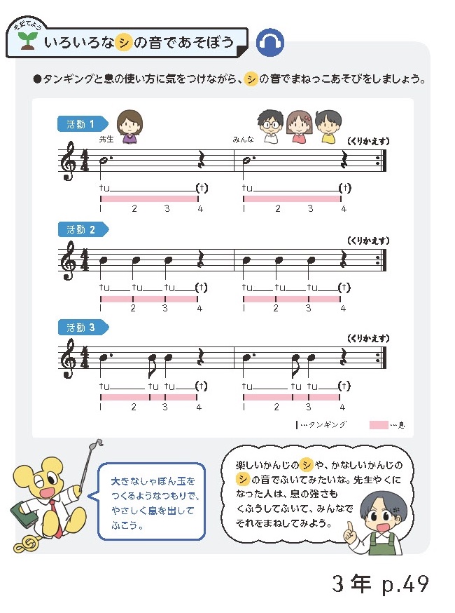 1〜4年生には発達段階や学習内容に応じた活動を掲載しました。鍵盤ハーモニカやリコーダーを活用した「常時活動」は、次の学習にもつながるウォーミングアップを兼ねています。