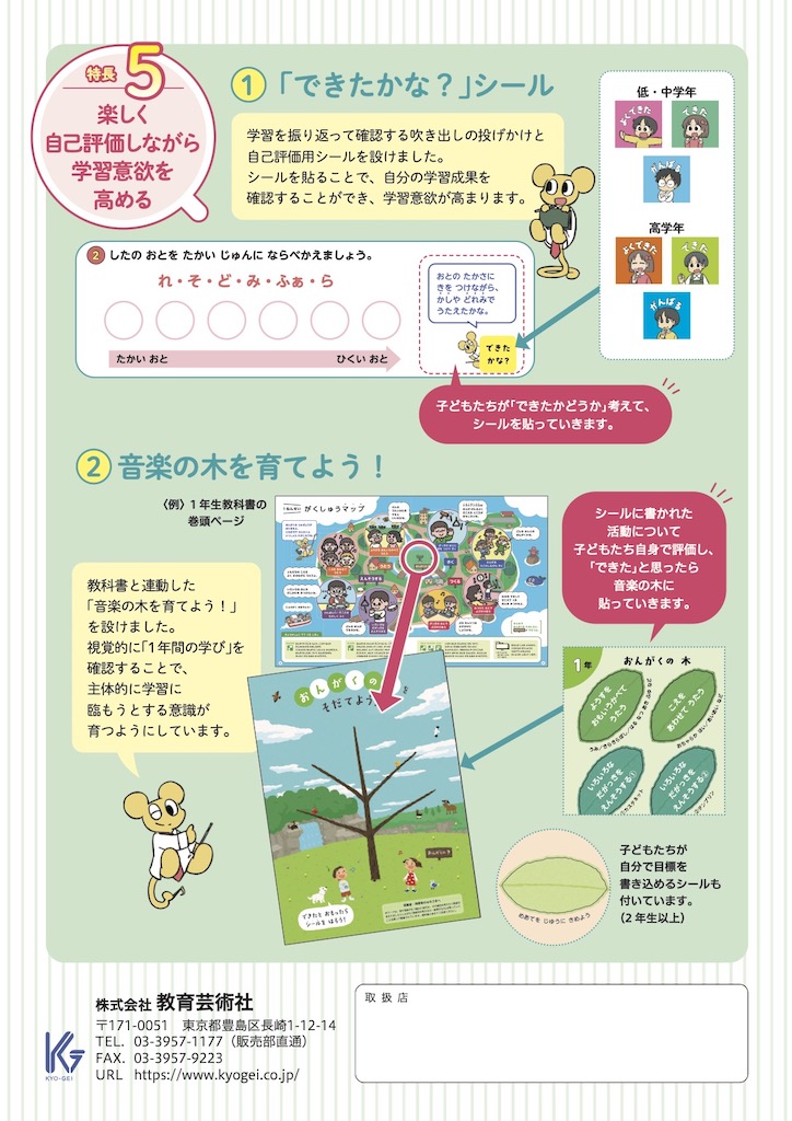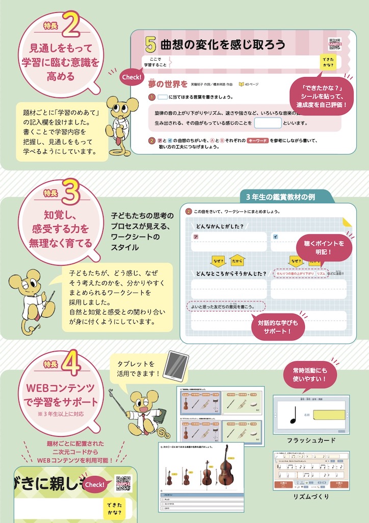 内容解説資料/検討の観点別に見た特色/二次元コード コンテンツ一覧/掲載曲一覧/編修趣意書/題材と系統一覧/年間学習指導計画作成資料/指導計画案(主な学習の流れと題材の評価規準例)/複式学級用 年間学習指導計画例/指導用CD・鑑賞用CD・音楽授業支援DVD収録内容/「音楽づくり」の6年間の学習の流れ
