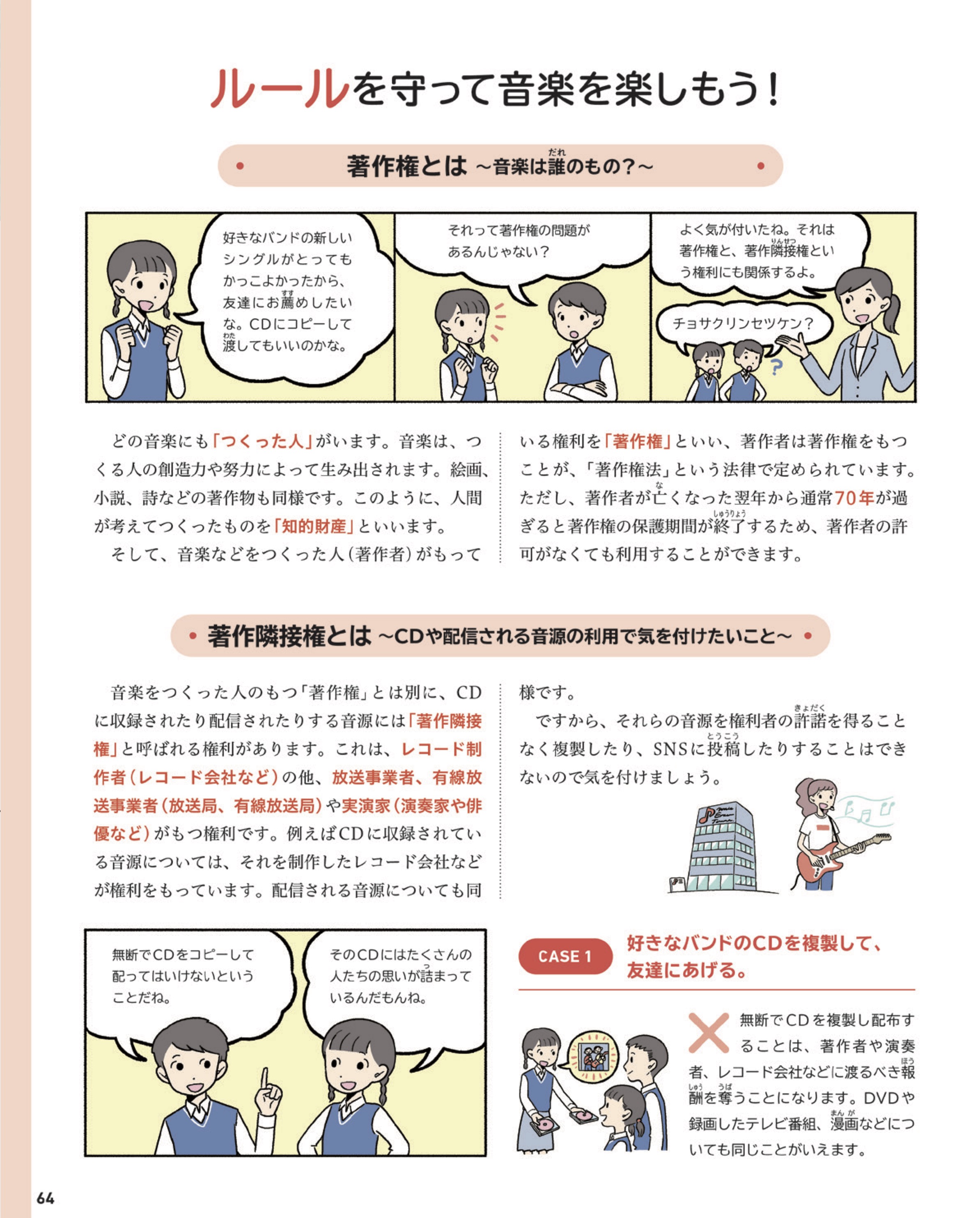 音楽に関する知的財産権について、生徒に身近な話題を例に、漫画を交えて親しみやすく解説しました。作品や著作者の創造性を尊重する態度の形成を図り、そのことが音楽文化の継承、発展、創造を支えていることへの理解を促します。