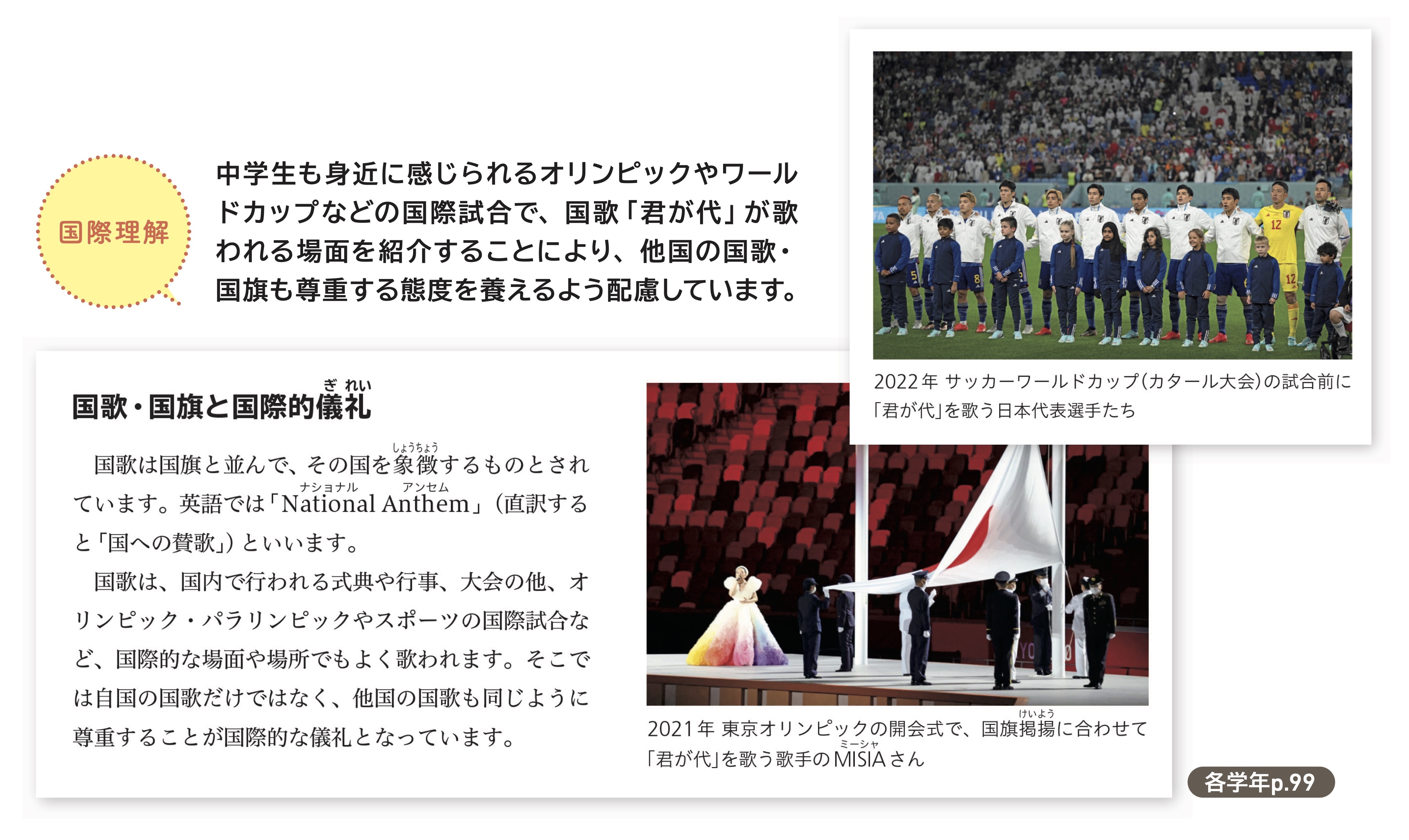 互いの人権を尊重し合うこと、つまり「自分の大切さとともに他の人の大切さを認めること」は、人権教育の理念でもあります。教科書で取り上げている楽曲の歌詞の内容や写真については、道徳教育や人権教育の観点に立って、十分に吟味して選んでいます。生徒たちが自分自身のよさや可能性を認識して個性を生かしながら、多様な他者を価値ある存在として尊重し、協働していくことができるよう配慮しました。